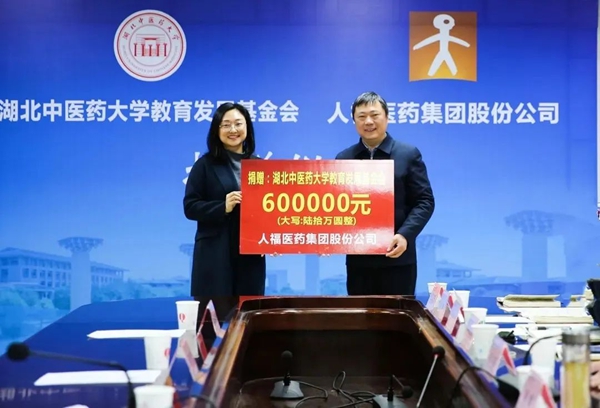 ? ? ? 3月23日,人福醫(yī)藥集團(tuán)與湖北中醫(yī)藥大學(xué)教育發(fā)展基金會舉行捐贈(zèng)儀式,人福醫(yī)藥集團(tuán)旗下武漢人福醫(yī)療管理有限公司向湖北中醫(yī)藥大學(xué)教育發(fā)展基金會捐贈(zèng)60萬元。捐贈(zèng)將在學(xué)校教育發(fā)展基金會設(shè)立“武漢人福醫(yī)療專項(xiàng)基金”,用于大學(xué)生創(chuàng)新創(chuàng)業(yè)項(xiàng)目扶持,培育創(chuàng)新創(chuàng)業(yè)成果;支持中醫(yī)藥產(chǎn)業(yè)發(fā)展相關(guān)的人才培養(yǎng);助力校友活動(dòng)。湖北中醫(yī)藥大學(xué)黨委書記唐峻,湖北中醫(yī)藥大學(xué)校長、教育發(fā)展基金會副理事長呂文亮,湖北中醫(yī)藥大學(xué)副校長、教育發(fā)展基金會副理事長黃必勝,湖北中醫(yī)藥大學(xué)校黨委常委張子龍,人福醫(yī)藥集團(tuán)總裁鄧霞飛、人福醫(yī)藥集團(tuán)黨委副書記孔娜、武漢人福醫(yī)療管理有限公司董事長曾志敏等領(lǐng)導(dǎo)共同參加捐贈(zèng)儀式。